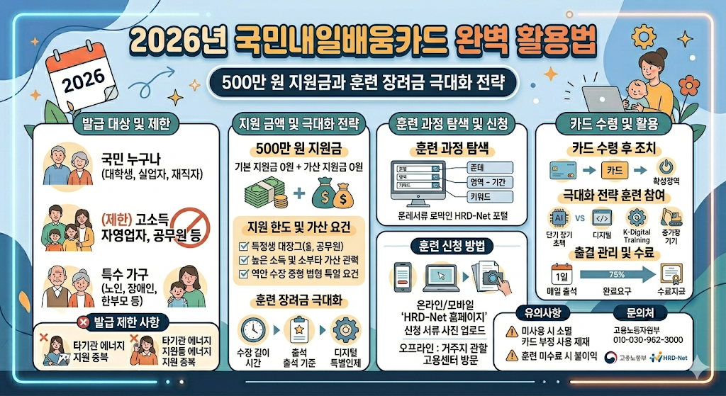 대한민국 국민이라면 누구나 일생에 걸쳐 직무 능력을 개발할 수 있도록 돕는 '2026년 국민내일배움카드'의 최신 혜택과 발급 절차를 전문가의 시각에서 분석했습니다. 본 포스팅에서는 1인당 300~500만 원까지 지원되는 훈련비 사용법과 함께, 구직자나 저임금 근로자가 매달 받을 수 있는 '훈련 장려금' 및 '특별훈련수당'을 최대한으로 수령하는 노하우를 상세히 안내합니다. 특히 2026년부터 확대된 디지털 신기술 분야(K-Digital Training)의 전액 무료 교육 혜택, 자영업자 및 특수고용직의 가입 문턱 완화 소식, 그리고 '직업훈련포털(HRD-Net)'을 통한 맞춤형 강의 선택 전략을 심층적으로 다룹니다. 취업 준비생부터 이직을 꿈꾸는 직장인, 인생 2막을 준비하는 중장년층까지, 국가가 제공하는 교육 예산을 활용해 자신의 몸값을 높이는 가장 똑똑한 커리어 로드맵을 지금 바로 확인해 보시기 바랍니다.